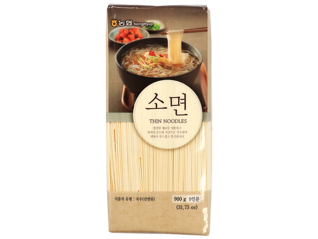 The dried thin noodles from NongHyup are traditional Korean wheat noodles with an especially fine diameter. They are ideal for light dishes such as Janchi Guksu (Korean banquet noodle soup), Bibim Guksu (cold noodles with sauce), or clear broths. Their delicate structure ensures a short cooking time and a tender texture. The 900g bulk pack is perfect for families or for stocking up.